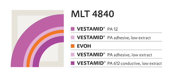????????MLT 4840的特殊之處在于,它的內層不是由含氟聚合物制成,而是由導電、低淬取性的VESTAMID聚酰胺612制成。因此,該系統(tǒng)非常適合使用擠出工藝加工,即使在與酒精長期接觸后也有優(yōu)異的抗靜電性能。