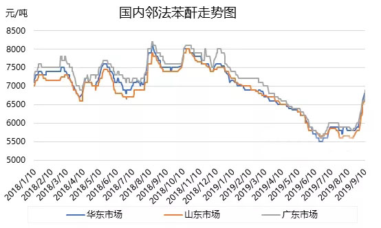 ????????如上圖所示,為苯酐行業價格走勢圖,價格呈現飆漲,且仍有漲勢預期。苯酐漲勢主要推動力在于原料鄰苯缺貨。鄰苯現貨供應緊缺,一方面是進口貨源寥寥,另一方面國內鄰苯裝置因素,影響鄰苯產量,目前中石化鄰苯價格上調至6500元/噸自提,相較于碼頭方面聽聞交投價格7300元/噸,及苯酐觸及7000元/噸價格,預計石化鄰苯仍有上調空間。鑒于鄰苯缺貨,苯酐廠家采購不到足夠鄰苯,加之環保等因素影響,開工不足,導致供不應求,價格不斷上揚。萘法苯酐亦是積極跟漲,貨少及工業萘走勢上行釋放利好,北方價格漲至6400元/噸自提,與鄰法苯酐價格6800元/噸,價差空間不大,預計苯酐行業仍有漲勢空間,為DOP、DBP行業提供強勁成本支撐。