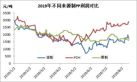 ????????此次東華能源計劃投產的裝置,繼續采用PDH工藝,為何近幾年來PDH裝置如雨后春筍般,蜂擁而至?首先從終端產品利潤來看。以聚丙烯為例,2019年丙烷脫氫制聚丙烯平均利潤在2000元/噸以上,下半年以來,因為丙烷價格震蕩下行,跌幅遠大于聚丙烯價格跌幅,生產企業利潤好轉。丙烷脫氫制聚丙烯利潤明顯好于煤制和油制利潤。