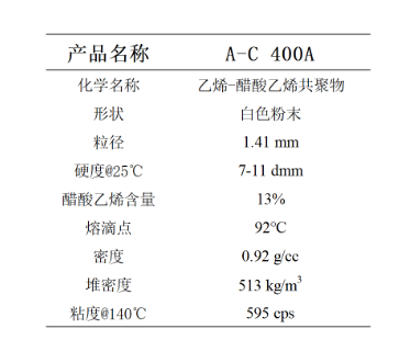 A-C 400A是有霍尼韋爾公司研發的一款乙烯-醋酸乙烯共聚蠟,擁有13%的游離醋酸乙烯含量。在塑料上可以作為很出色的分散劑,使得極性顏料、炭黑、填料能夠更好的在聚合物中分散開,在熱熔膠中能夠起到增加附著力和低溫降粘的作用。