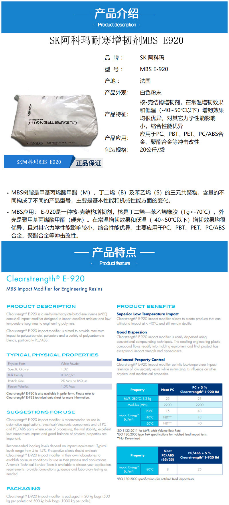 • 增韌劑MBS E920 抗沖擊改性劑 PC/ABS工程塑料增韌 SK阿科瑪E-920 物性表, 增韌劑MBS E920 抗沖擊改性劑 PC/ABS工程塑料增韌 SK阿科瑪E-920 產(chǎn)品參數(shù),增韌劑MBS E920 抗沖擊改性劑 PC/ABS工程塑料增韌 SK阿科瑪E-920 性能表,增韌劑MBS E920 抗沖擊改性劑 PC/ABS工程塑料增韌 SK阿科瑪E-920 出廠報告, MSDS,, 物質(zhì)安全資料表, UL黃卡,{ SGS報告, RoHS, 食品級認(rèn)證, NSF飲用水標(biāo)準(zhǔn), 產(chǎn)品資料, 產(chǎn)品性能, 出廠報告, 原廠原包, 代理商, 熱變形溫度, 熔指數(shù), 流動系數(shù), 抗沖擊性能、沖擊強度, 低溫韌性、低溫抗沖擊性能, 熔體流動系數(shù)、熔體流動速率, 加工工藝、加工參數(shù)、加工溫度, 歐盟RoHS 德國FDA 美國FDA 日本FDA