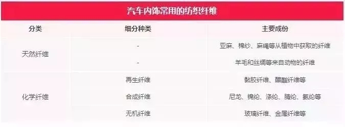 ????????紡織纖維在汽車內飾中主要用于汽車座椅、車廂內壁、頂棚表皮、安全帶、隔音墊、地墊等,除了具備一定的產品功能性之外,相對于其他材料,紡織纖維在汽車隔音、隔熱、降噪方面有一定的優勢。