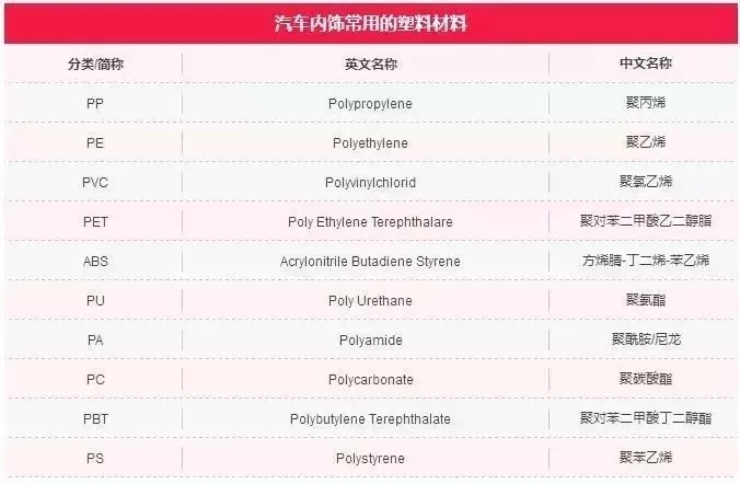 ????????根據樹脂的分子結構和熱性能的不同,塑料分為熱塑性塑料和熱固性塑料。汽車內飾常用的塑料大多是熱塑性塑料,主要包括PP、PE、PVC、PET、ABS等。
