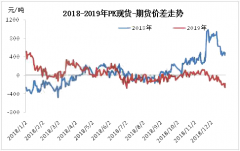 2019年中國PE期現(xiàn)基差范圍較2018年縮窄,以華北煤化工7042價(jià)格與LL主力合約結(jié)算價(jià)基差來看,全年升貼水范圍...