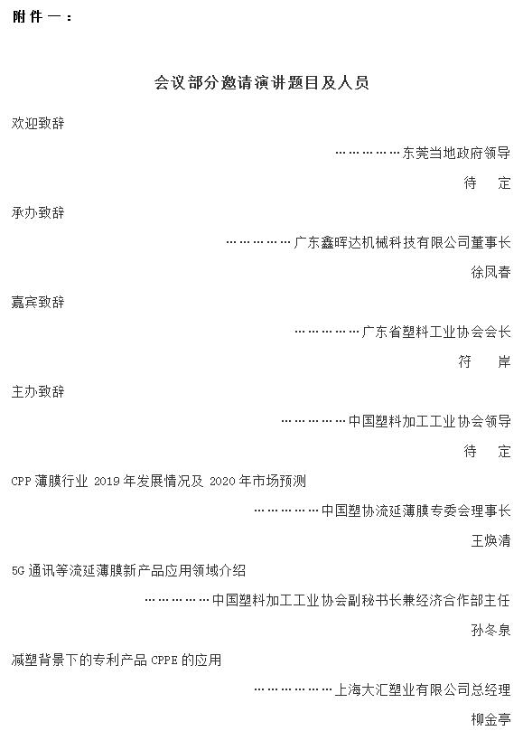????????2019年12月26日全天報到,26日下午14:00召開流延薄膜骨干企業負責人2019年度經濟工作座談會暨流延薄膜專委會理事會擴大會議,27日開全體大會,12月27日下午四點參觀廣東鑫暉達機械科技有限公司