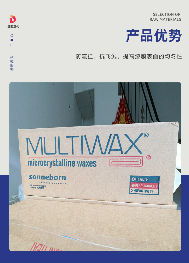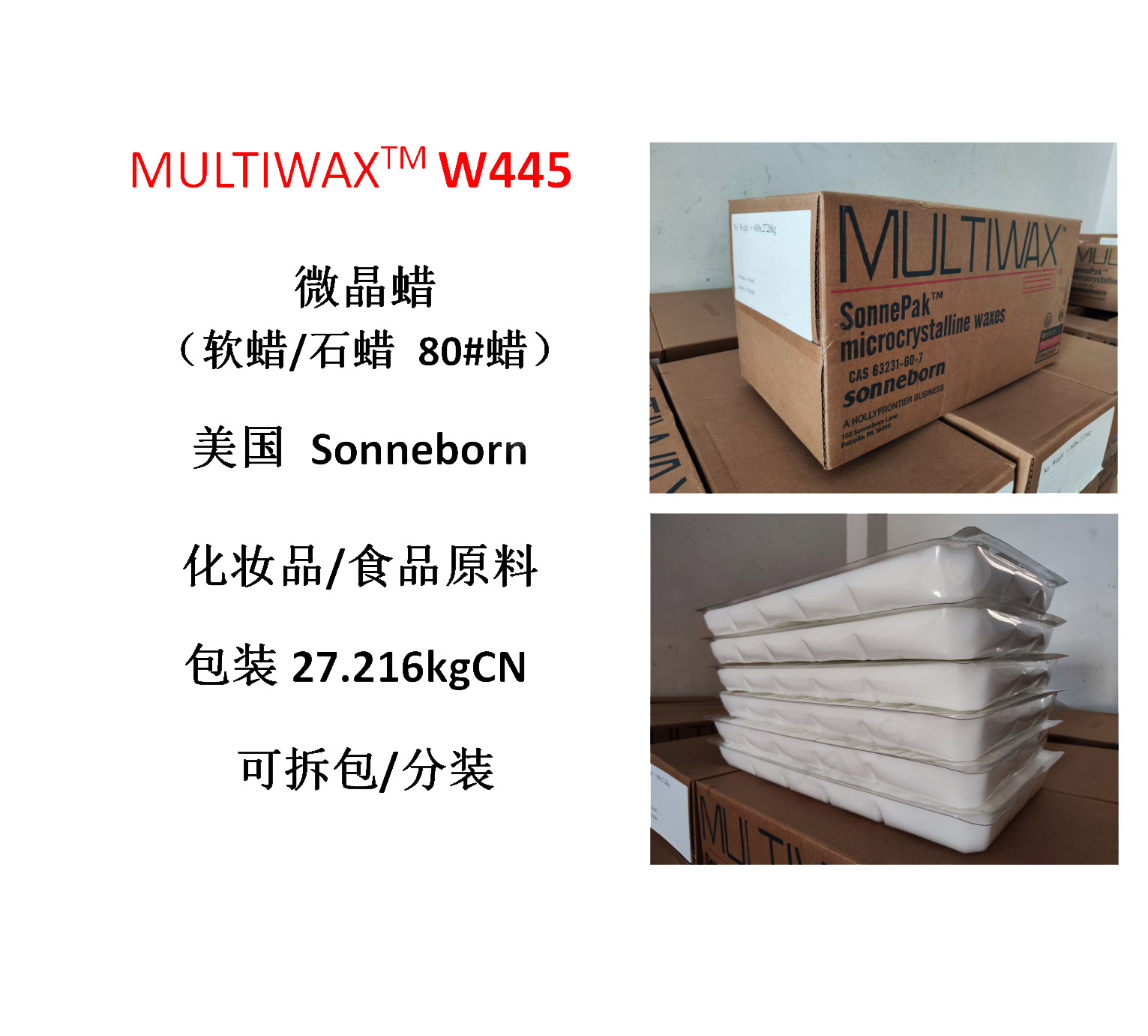 美國微晶蠟-W445  產品用途:產品適用于軍品、電子、冶金、化工、日化、醫藥及食品等行業,用于防潮、粘結、上光、絕緣、鈍感、鑄模、橡膠、醫藥、化妝品、食品組份及食品包裝等。  產品性能特點:  1 、本產品以減壓渣油為原料,經丙烷脫瀝青、糠醛精制、酮苯脫蠟脫油、白土補充精制等深加工而制得。外觀為淺黃色、白色(加氫精制)固體,其結晶微細,有較好的滲透性、附著性及韌性,且防潮、絕緣性好。  2 、熔點高、硬...